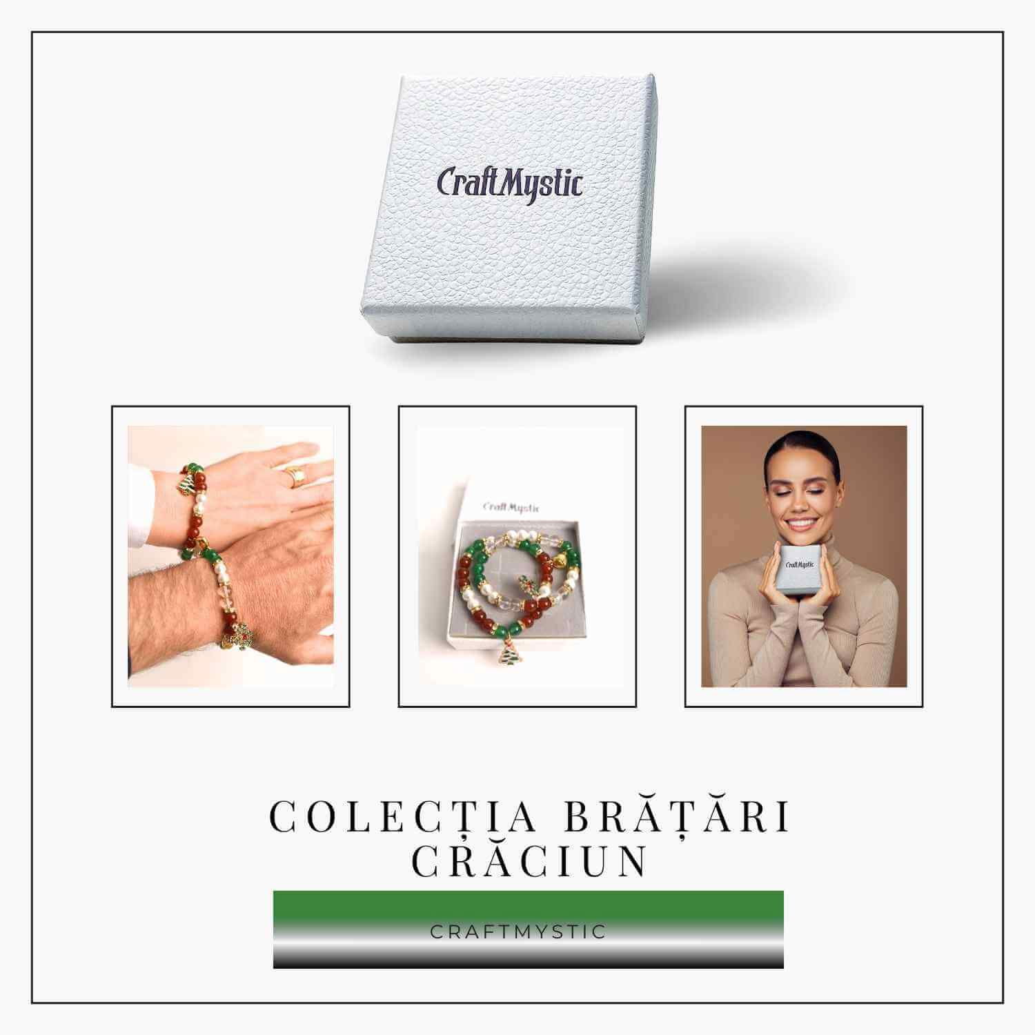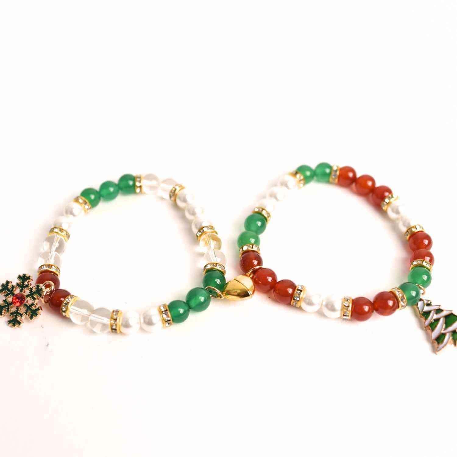 Set brățări cuplu aurii cu pietre naturale: Agat roșu și verde, perlă, cuarț alb, cu accesorii brăduț și fulg de nea, lucrate manual pentru un design unic. Cadoul perfect pentru cei dragi, simbolizând iubirea, protecția și energia pozitivă.