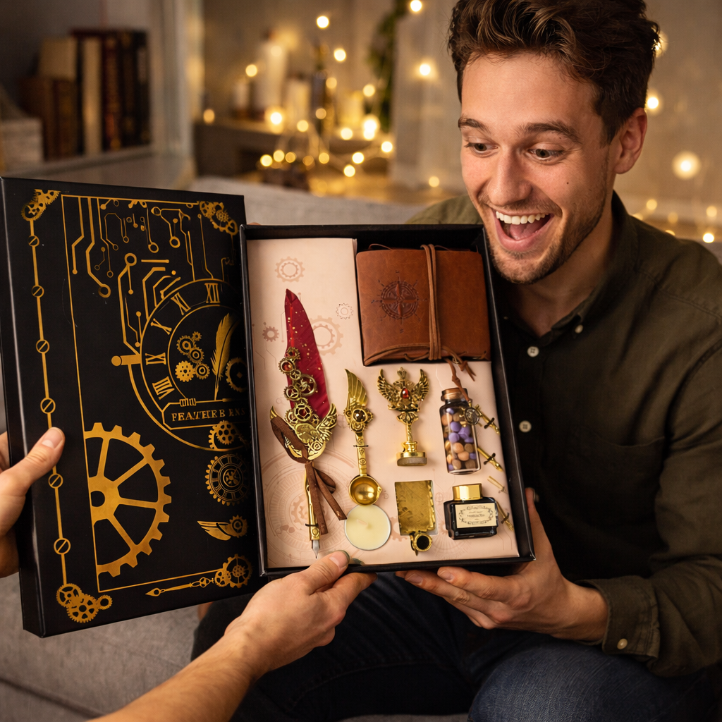 Acest set este realizat in stil steampunk, cu detalii metalice elegante, pene decorative lucrate atent si accesorii complete pentru sigilii. O combinatie rafinata intre scris caligrafic, estetica veche si obiecte cu valoare decorativa – o adevarata comoara pentru pasionatii de scris, colectii si creatie autentica.