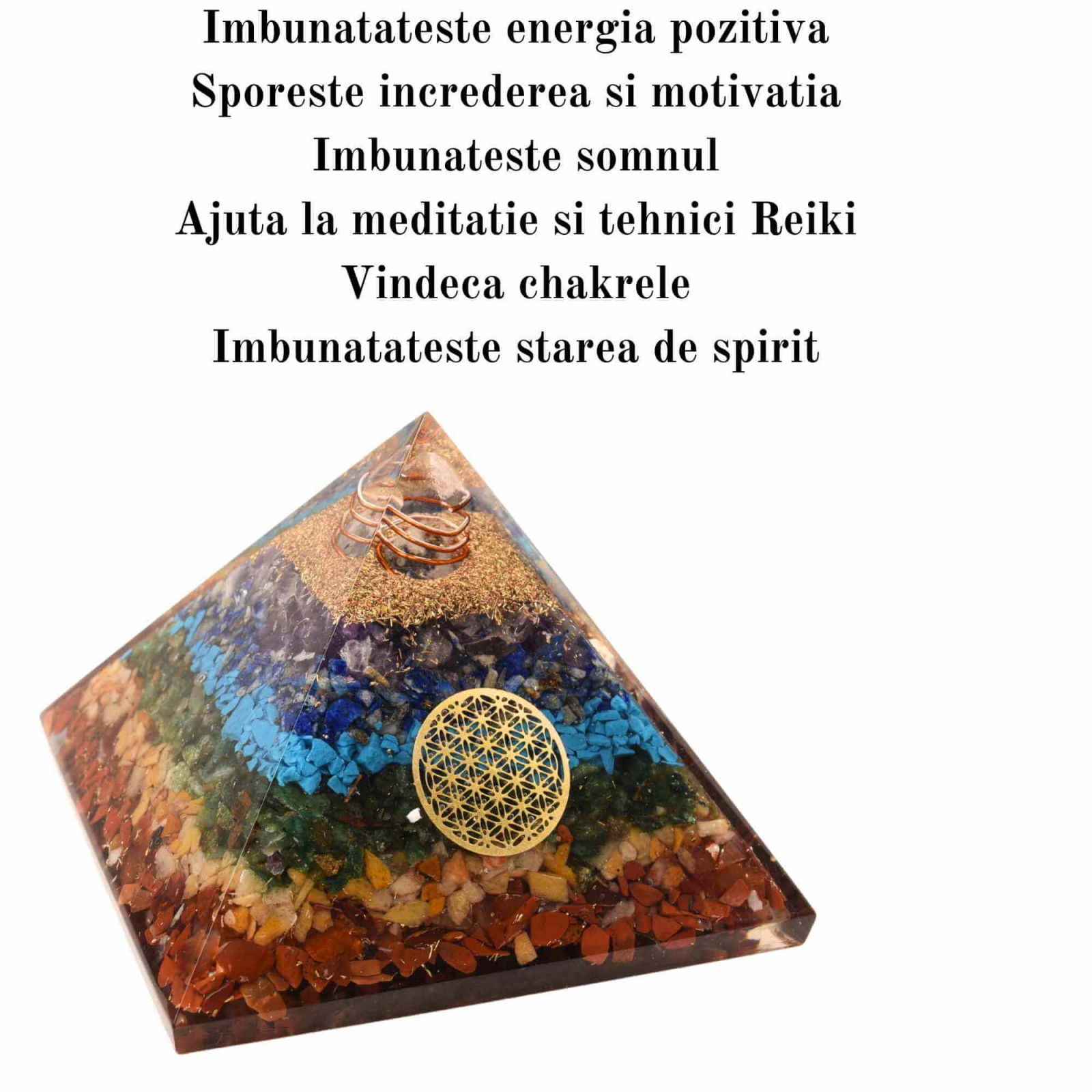 - Complexitate si Sincronizare a Sapte Chakre: Aceasta piramida Orgonica cu sapte chakre imbina energiile ametistului, turcoazului, aventurinului verde, lapis lazuli, jaspului rosu, aventurinului rosu si jaspului galben. Este alcatuita din 7 straturi, cu Flori de Viata din cupru si garoafe rosii, oferind o sursa echilibrata de energie pozitiva;