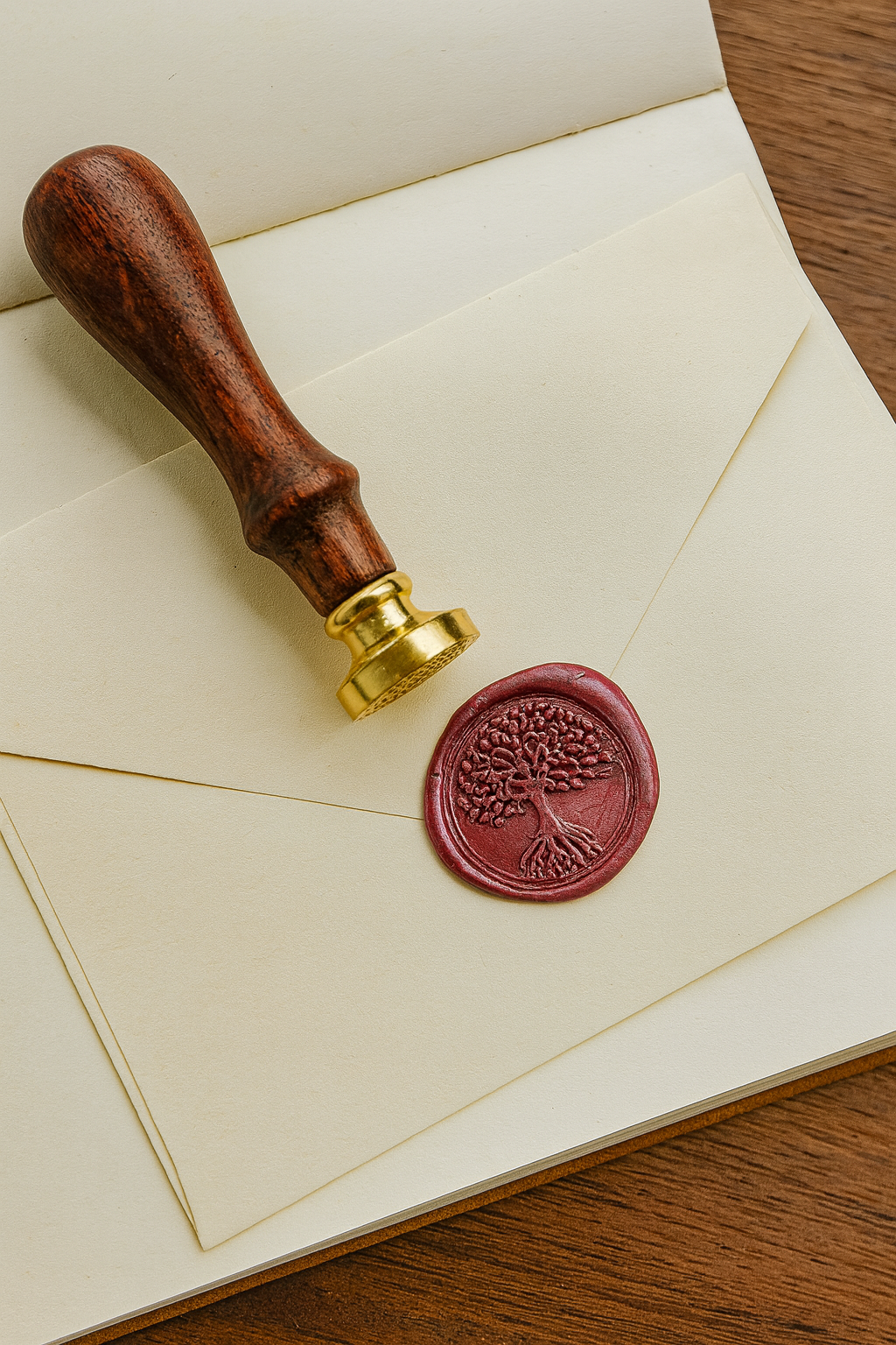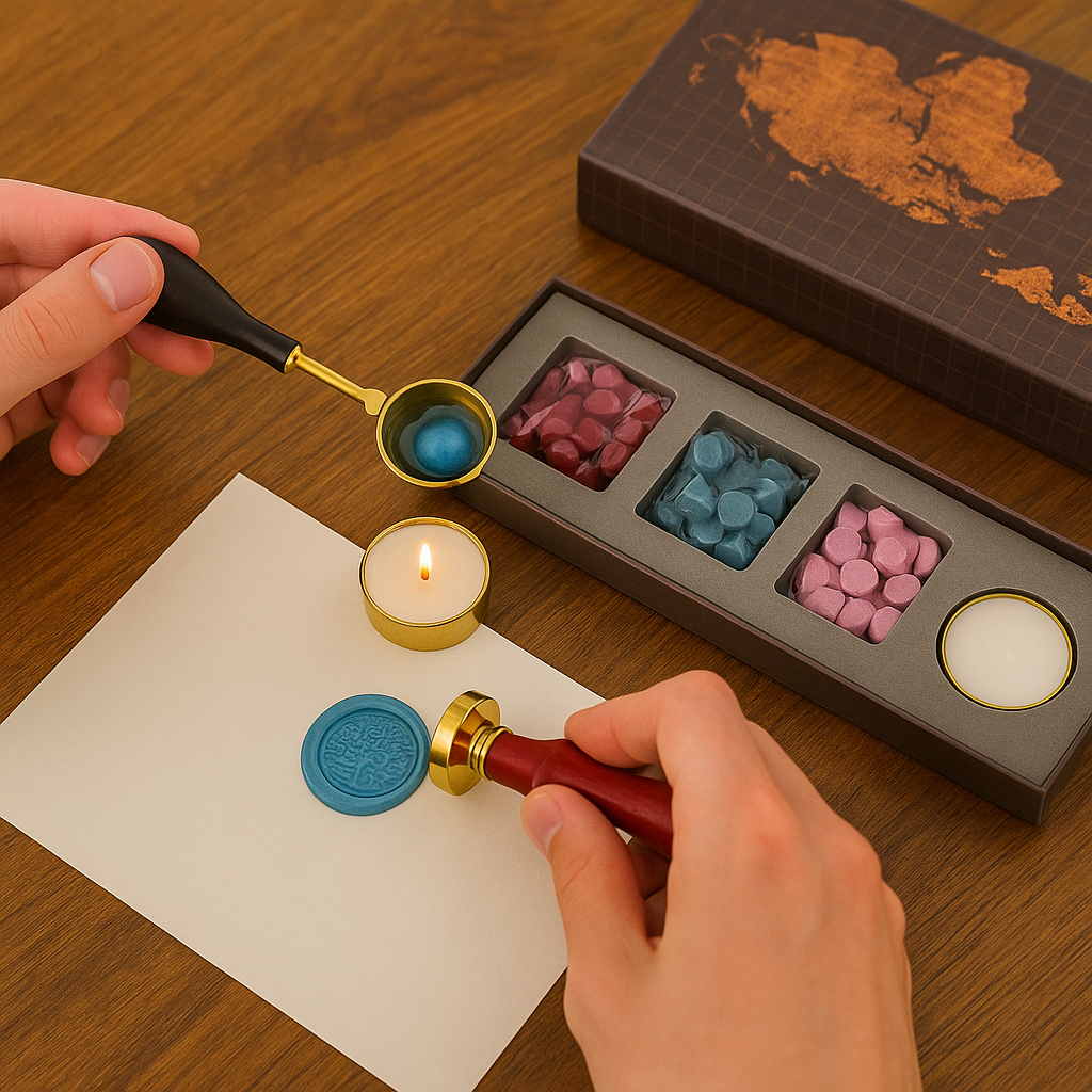 Utentilic usor de folosit: topesti 2–3 bucati de ceara in lingurita la lumanare, torni pe plic si presezi stampila 5–10 secunde. Rezultatul: un sigiliu neted, uniform si elegant.