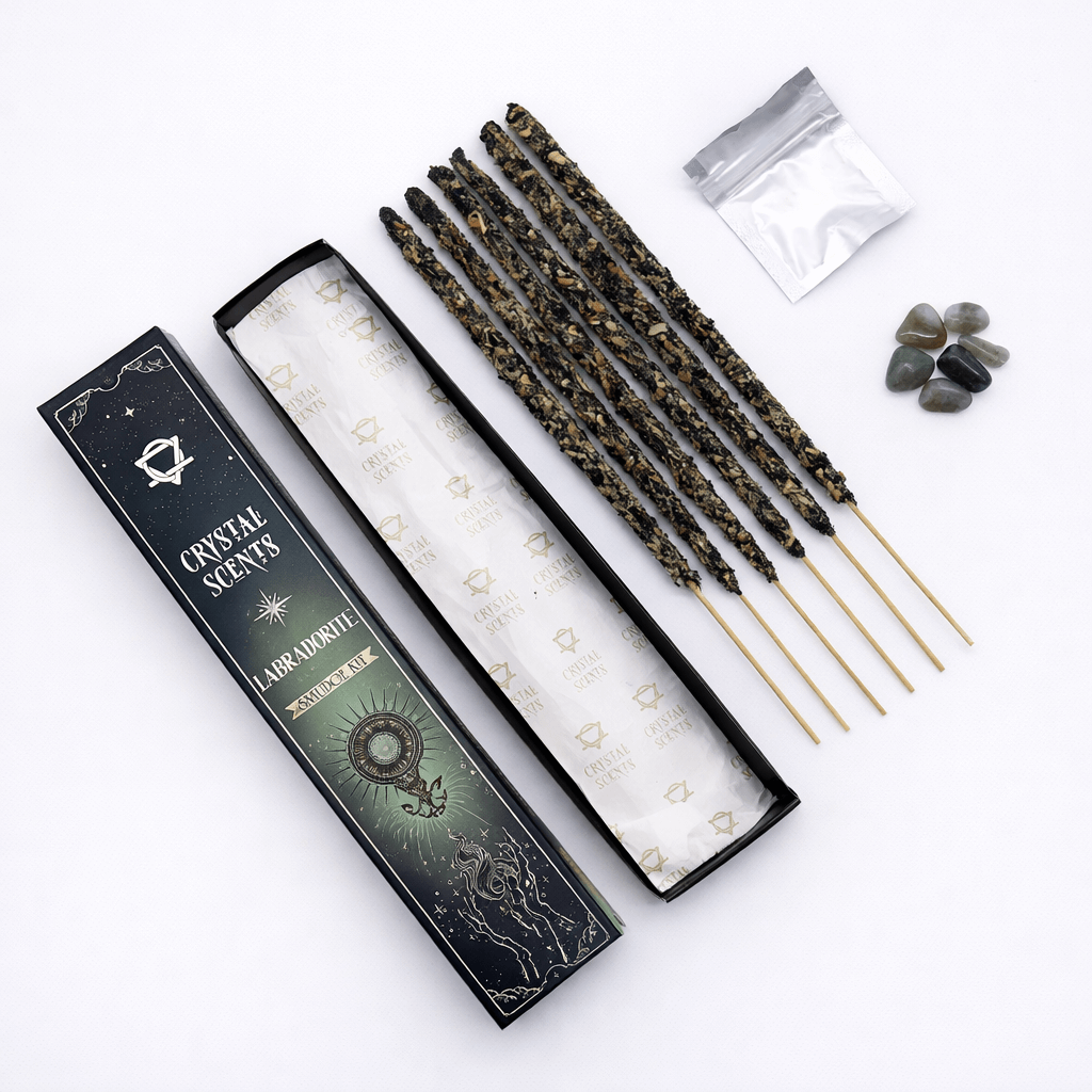 Labradoritul este o piatra a misterului si a transformarii, cunoscuta pentru capacitatea sa de a crea un scut energetic protector. Forma naturala a cristalelor simbolizeaza conexiunea autentica cu energia universala, iar reflexiile sale irizante sunt asociate cu lumina interioara si trezirea intuitiei. Ritualul de ardere sustine eliminarea energiilor stagnante si activarea claritatii interioare.