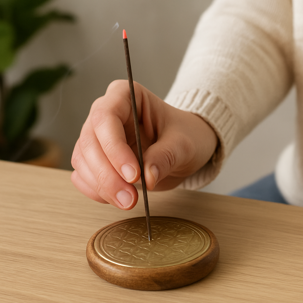 Suport rotund din lemn de mango, cu placuta metalica aurie gravata Flower of Life. Potrivit atat pentru betisoare parfumate, cat si pentru conuri – creeaza un spatiu sigur si elegant pentru aromaterapie, meditatie sau yoga. Diametru aprox. 8.5 cm.