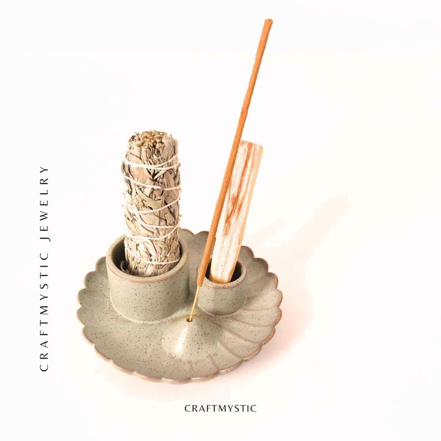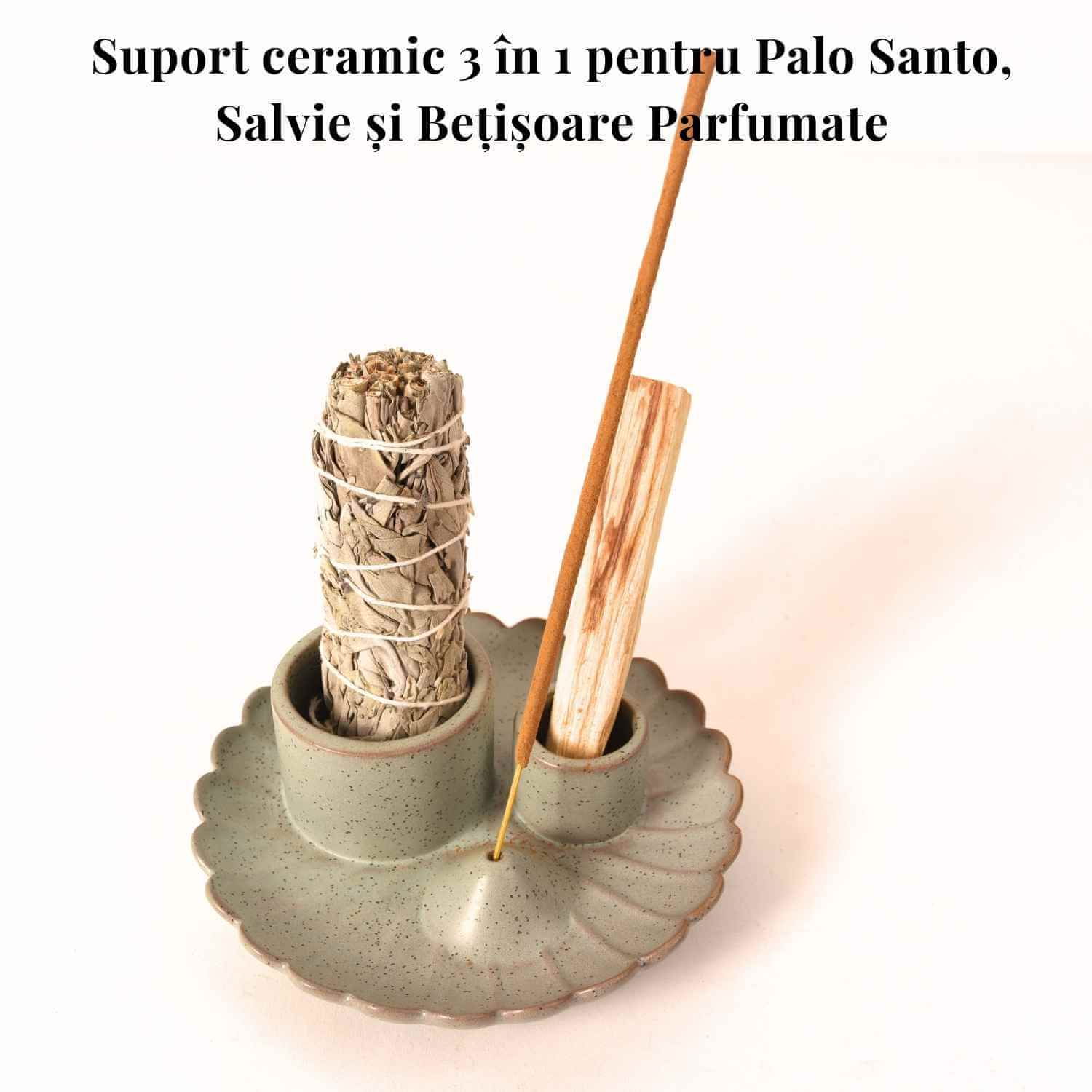 • Suport 3 în 1: pentru salvie, Palo Santo și bețișoare parfumate