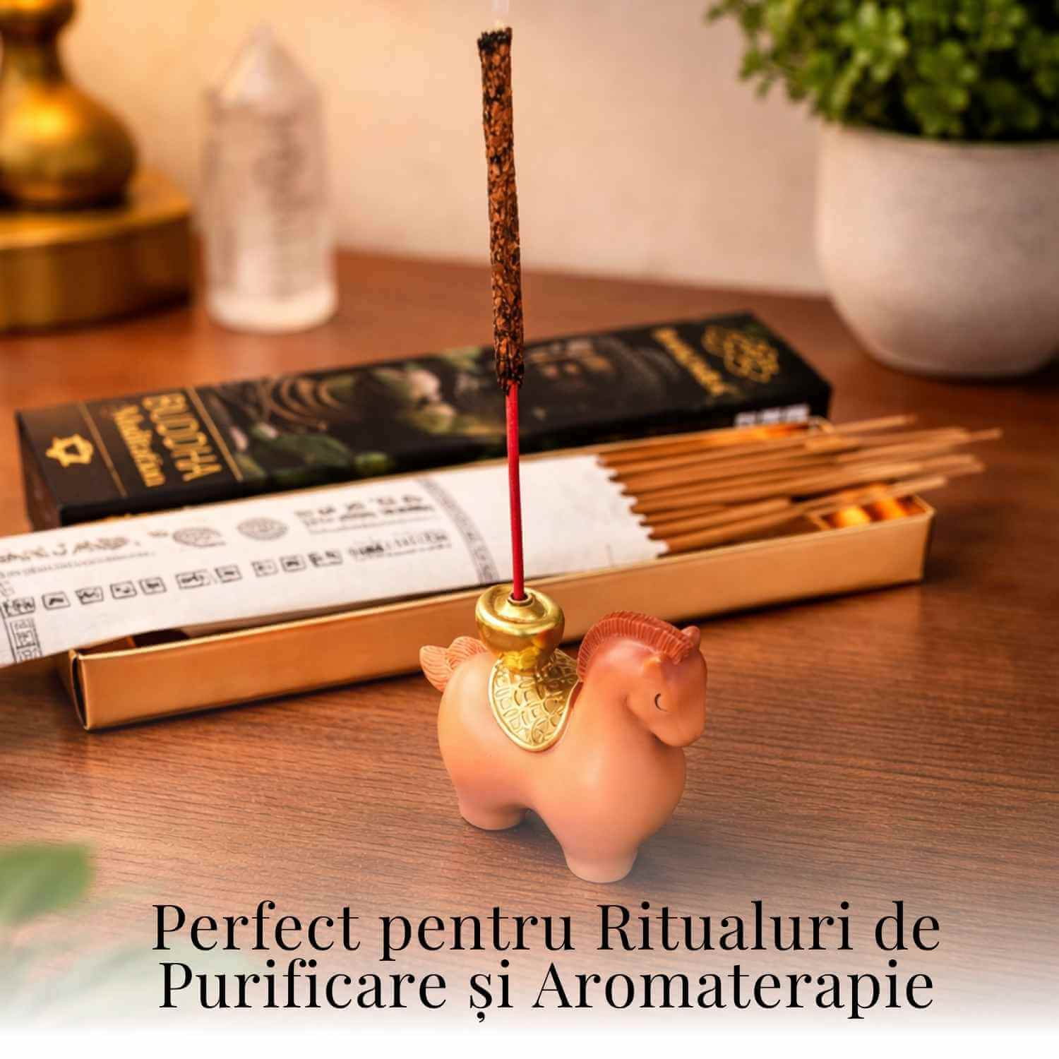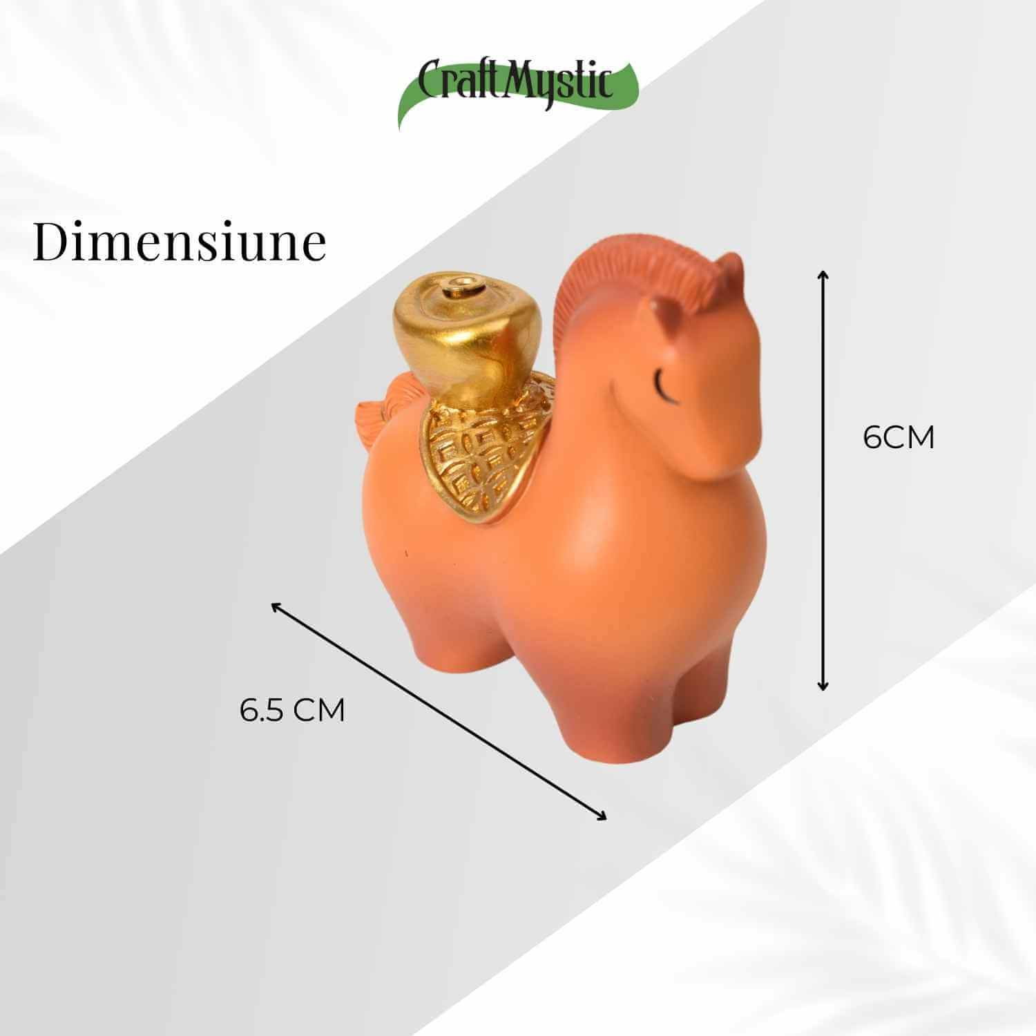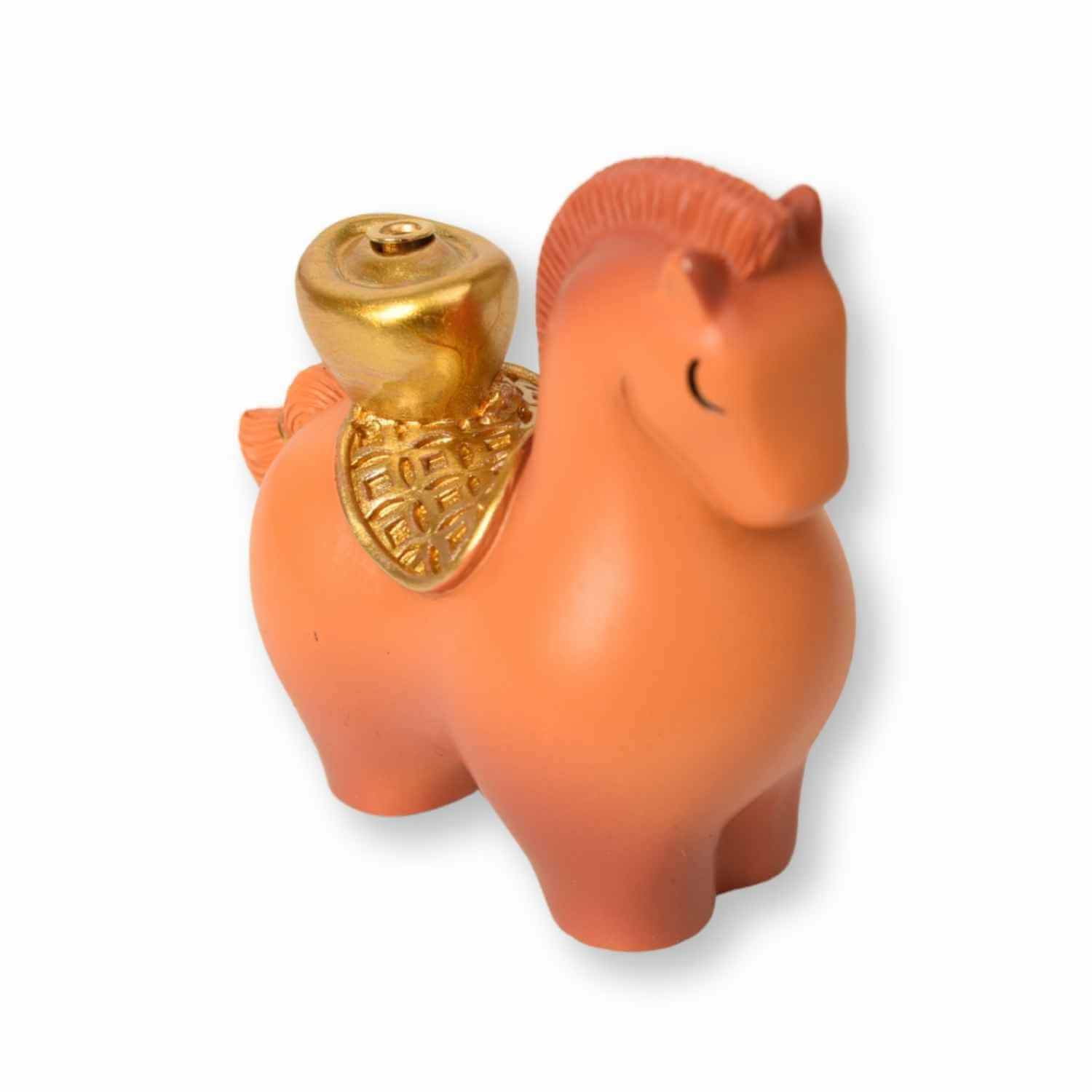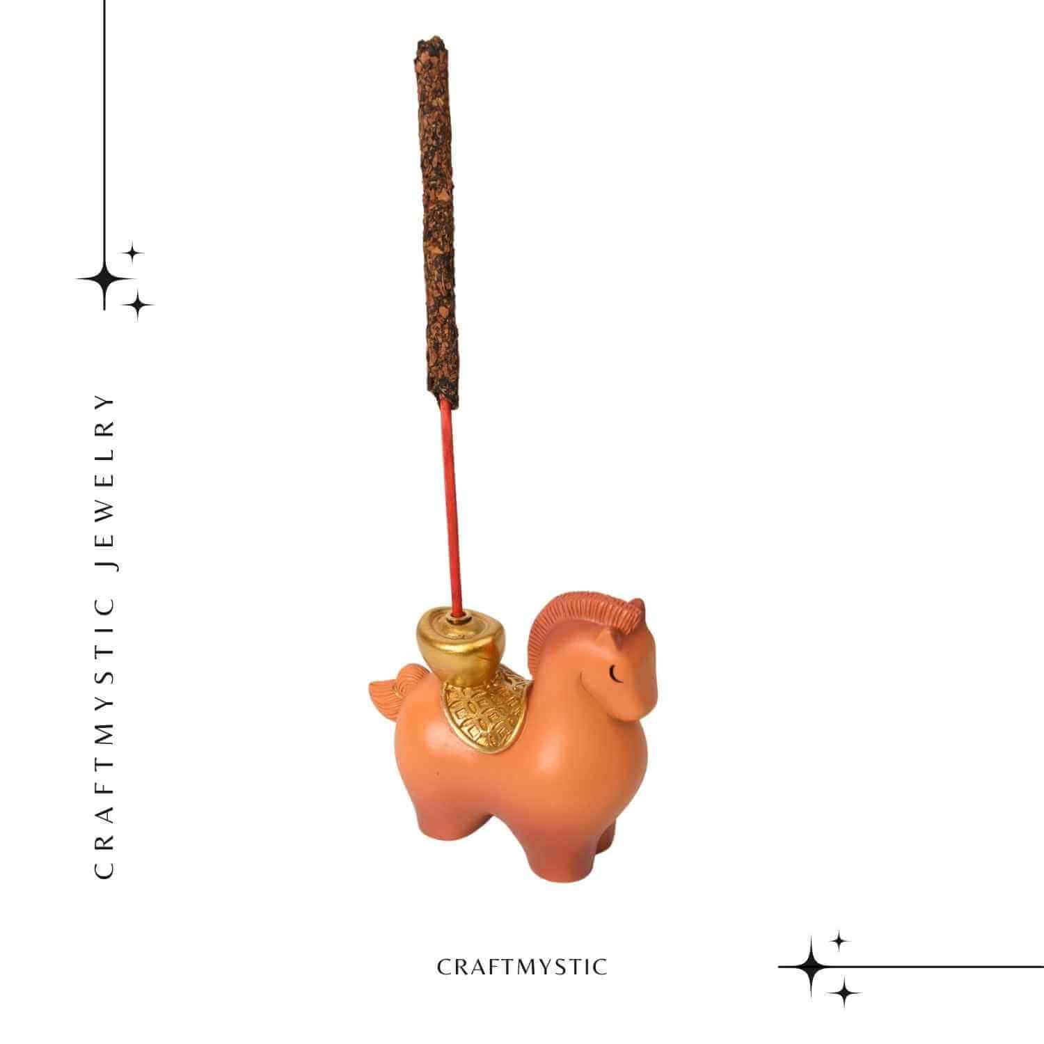 Formă jucăușă de căluț, în nuanță caldă teracotă, este completată de detalii aurii elegante, oferind un aspect rafinat și plăcut vizual. Este genul de piesă care nu doar susține bețișorul parfumat, ci creează o atmosfera – fie că îl așezi pe birou, noptieră sau în colțul tău de meditație.