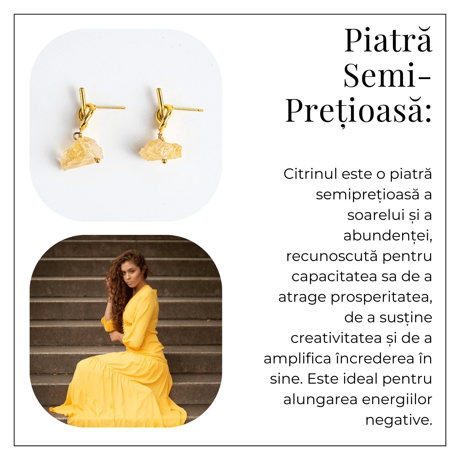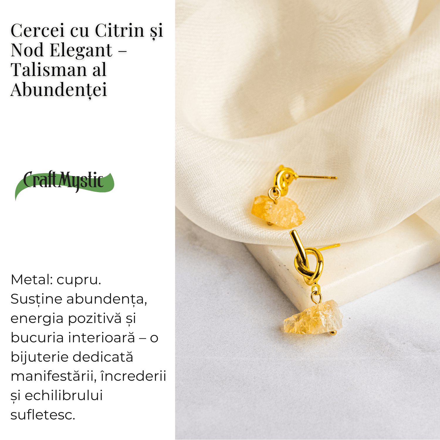 Citrinul este cunoscut ca piatra abundenței, a bucuriei și a succesului. El amplifică energia solară, optimismul și încrederea în sine, susținând manifestarea prosperității și atragerea oportunităților. Designul cu nod simbolizează fluxul continuu al energiei și echilibrul dintre dăruire și primire – o bijuterie perfectă pentru cei care doresc să își manifeste visele cu încredere.