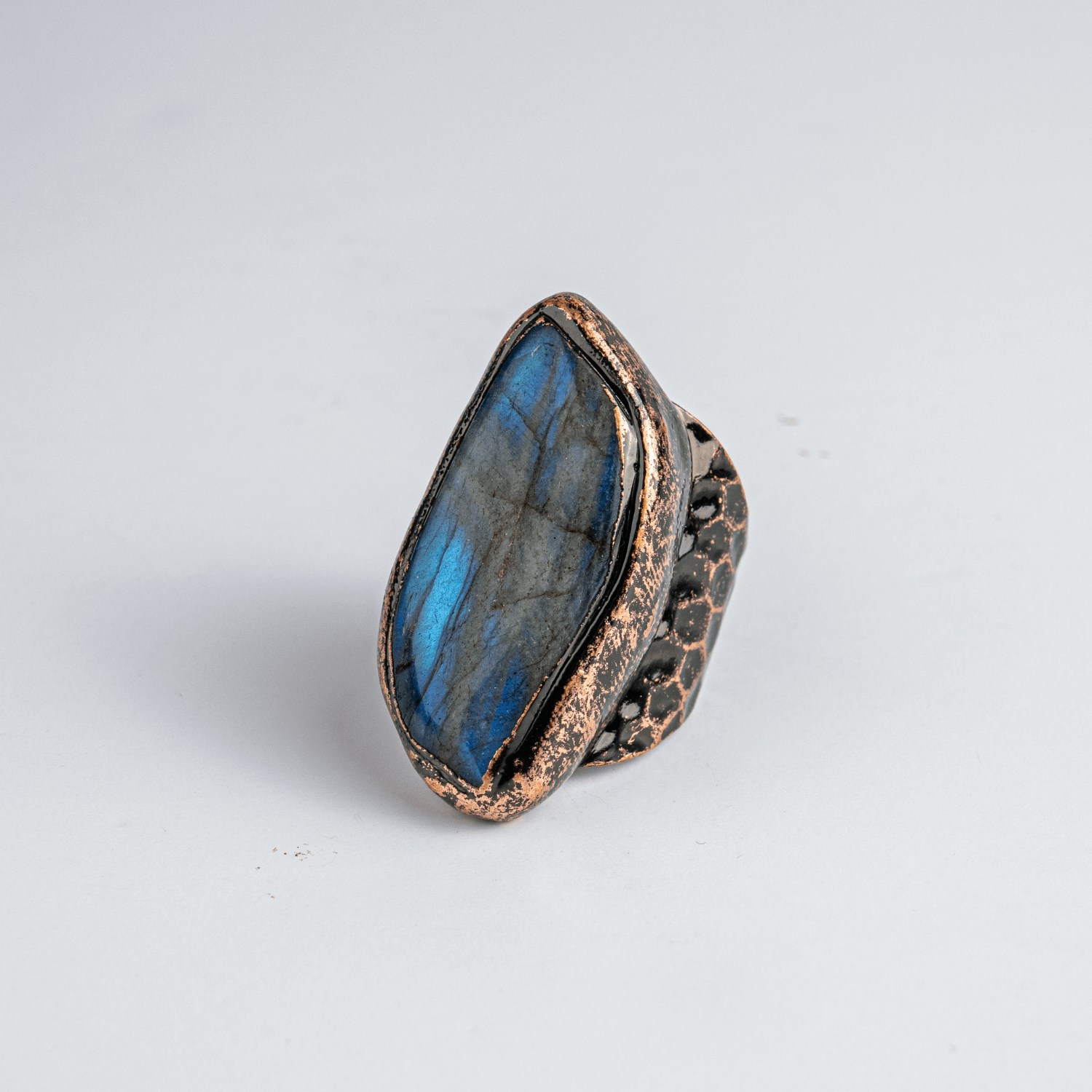 Tip piatră: Labradorit natural, brut (fiecare piatră este unică, cu diferențe de culoare și textură, aducând un caracter personalizat fiecărui inel)