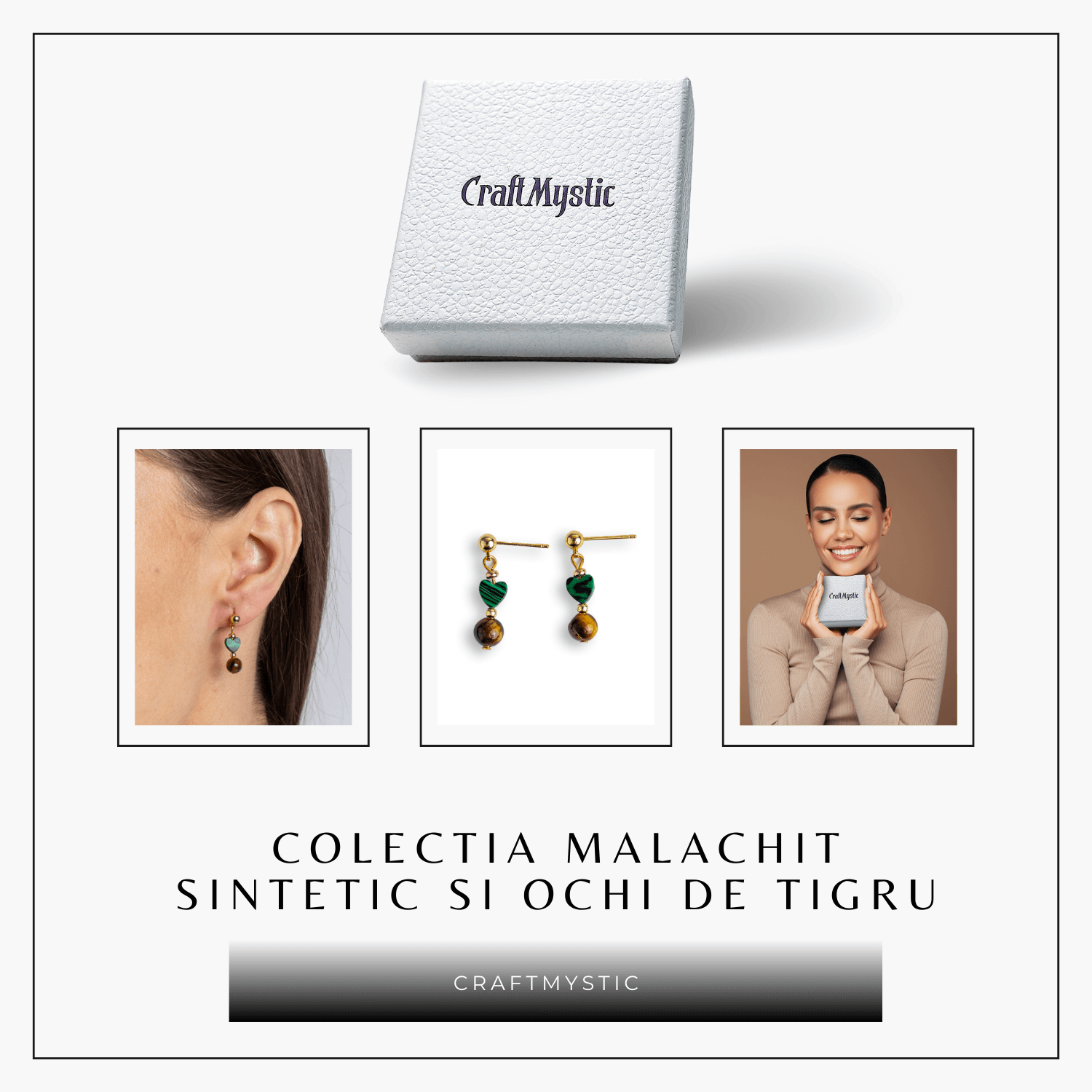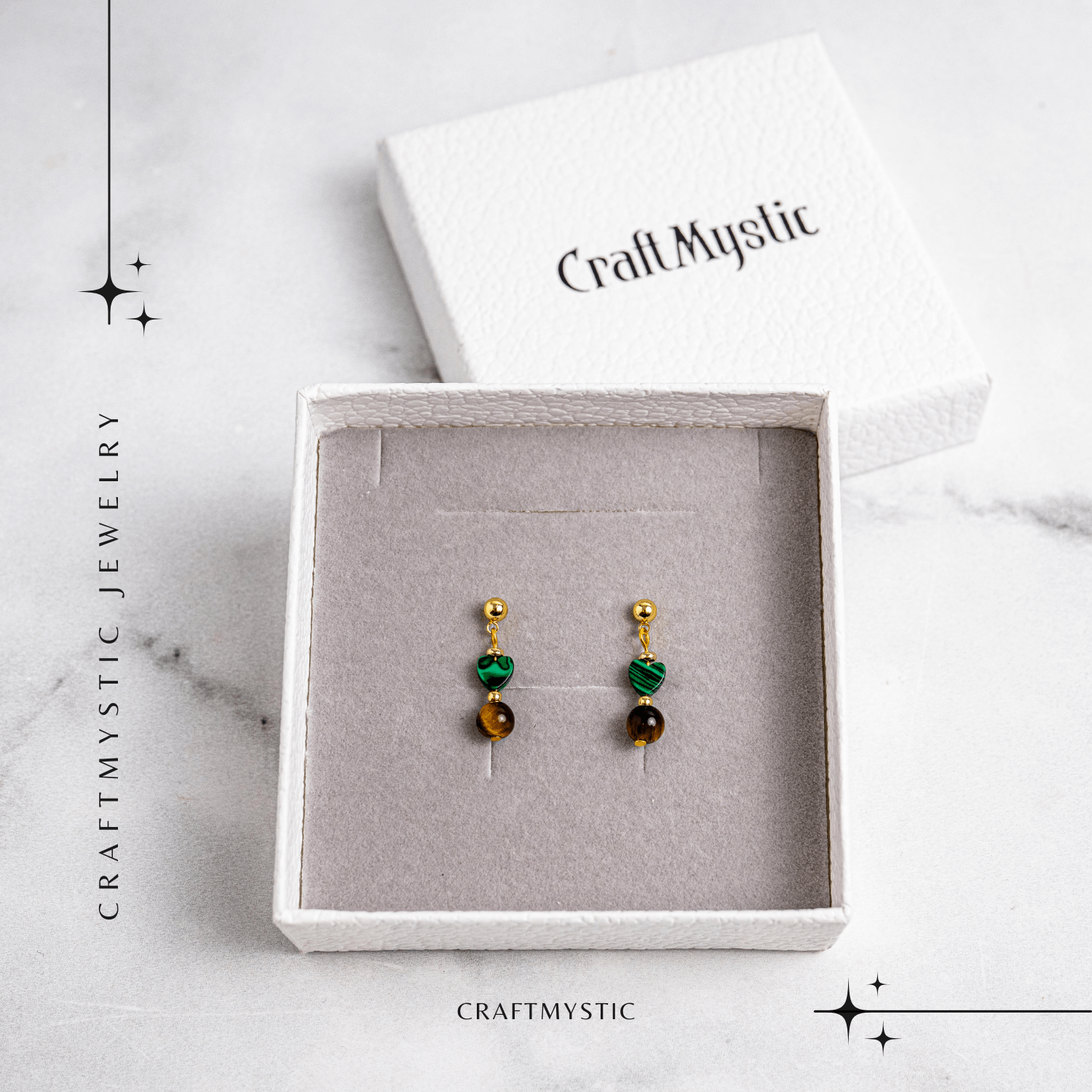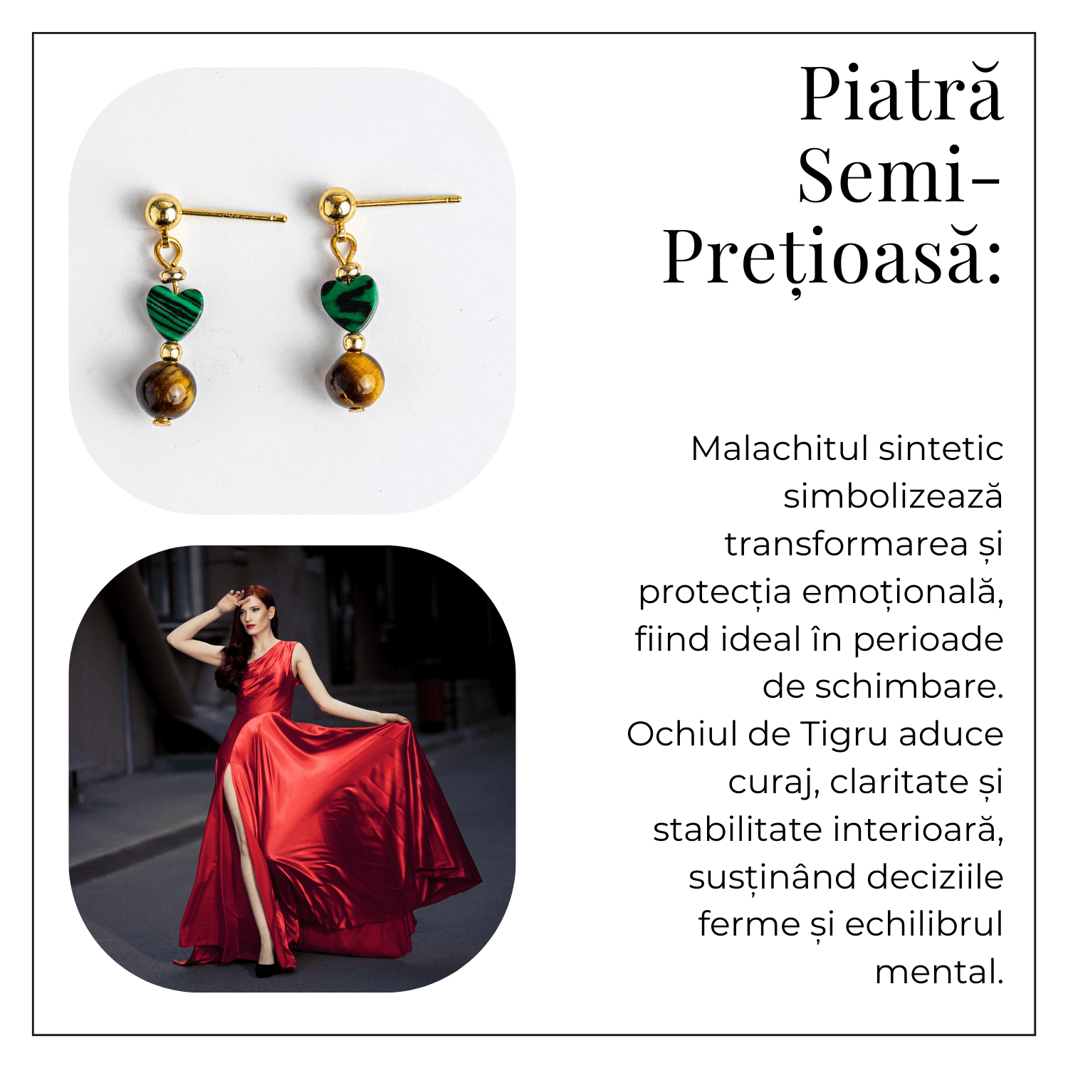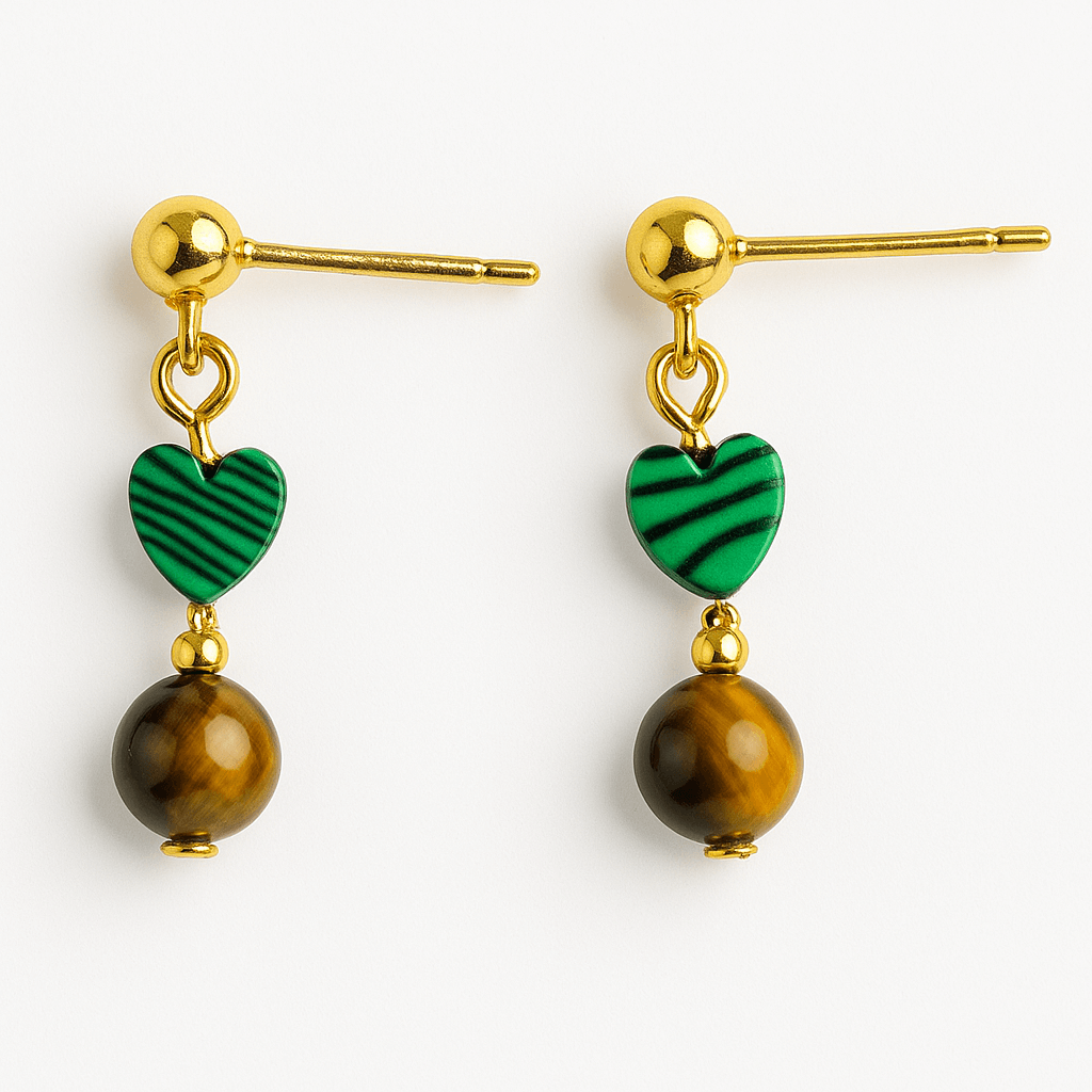 Acești cercei îmbină două pietre puternice – malachitul, piatra transformării și regenerării emoționale, cu ochiul de tigru, cristalul curajului și protecției. Împreună, ele devin un talisman subtil pentru cei ce doresc să-și redescopere forța interioară.