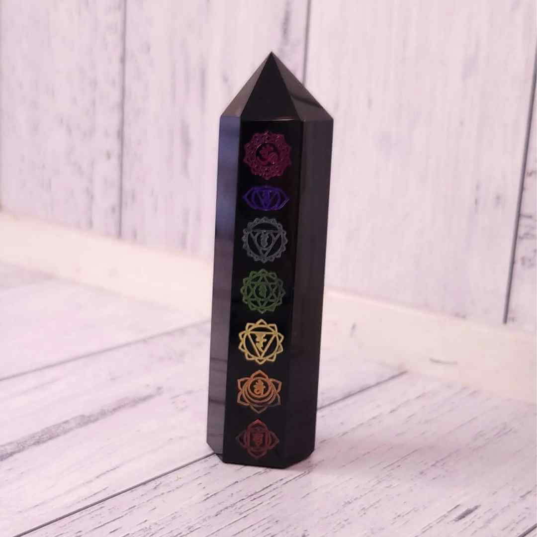 Turn de cristal din Obsidian Negru 9-10 cm cu cele 7 Chakre - Baghetă hexagonală pentru vindecare, reiki și decor pentru casă și birou