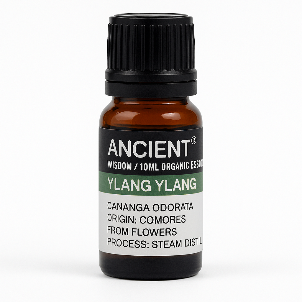 Ylang Ylang organic – ulei esențial 100% pur, extras prin distilare cu abur din florile arborelui Cananga odorata (origine: Comoros). Aroma lui este florală, dulce, exotică, apreciată în aromaterapie pentru relaxarea profundă, reducerea tensiunii și pentru notele senzuale din parfumuri și cosmetice DIY.